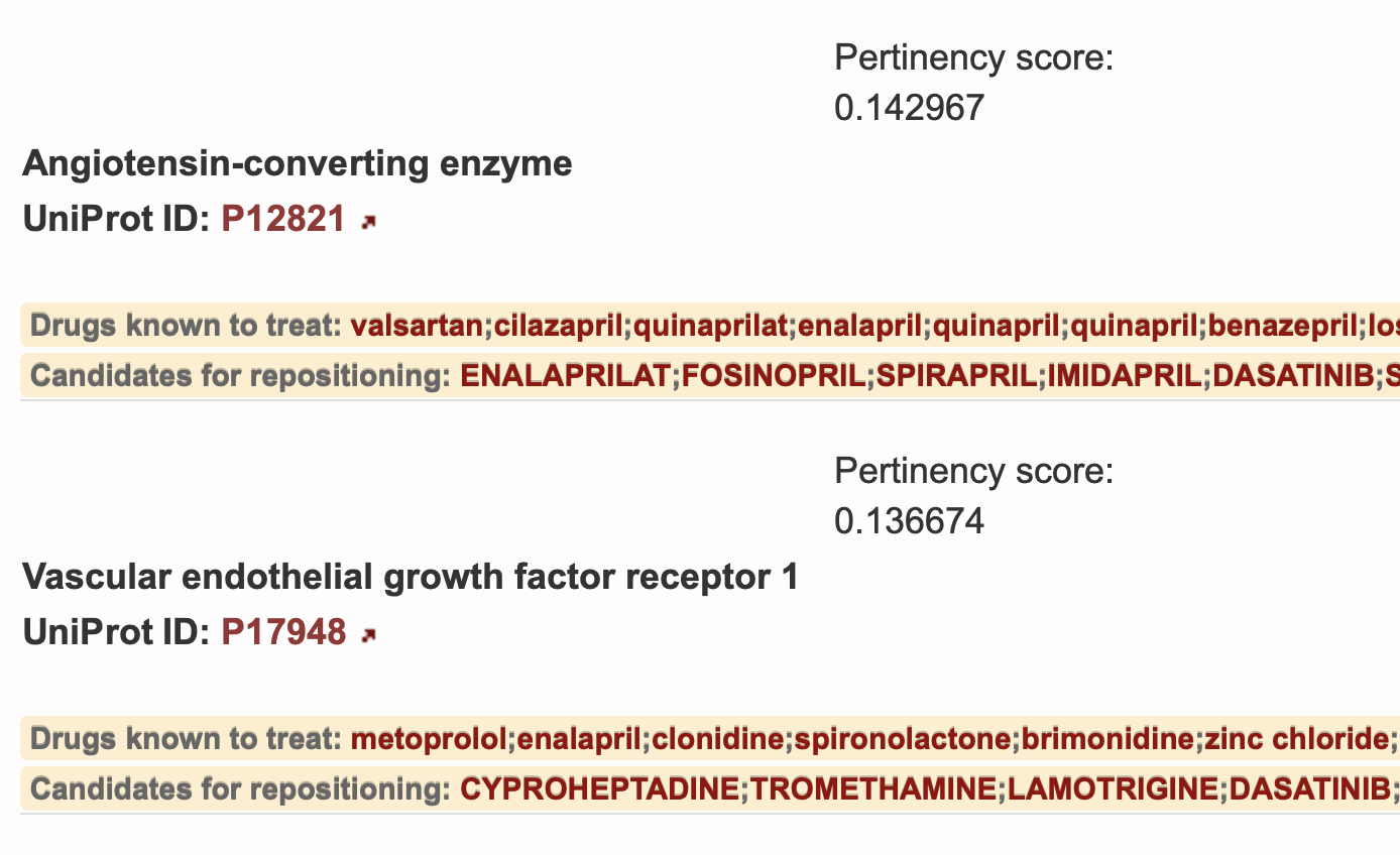 A prioritized list of proteins is shown in Figure 3. On the left, the accepted protein name is displayed and it's respective UniProt ID can be found immediately below it. The UniProt ID is linked to it's corresponding information page within the UniProtKB database. The calculated pertinency score is shown to the right of each protein target which estimates the probability that the protein target is relevant in the disease mechanism and the associated medications may be pertinent in the treatment of the selected disease. A label is provided for each medication as to whether it is known to treat or not known to treat the selected disease. Drugs not currently known to treat the disease are described as repositioning candidates.