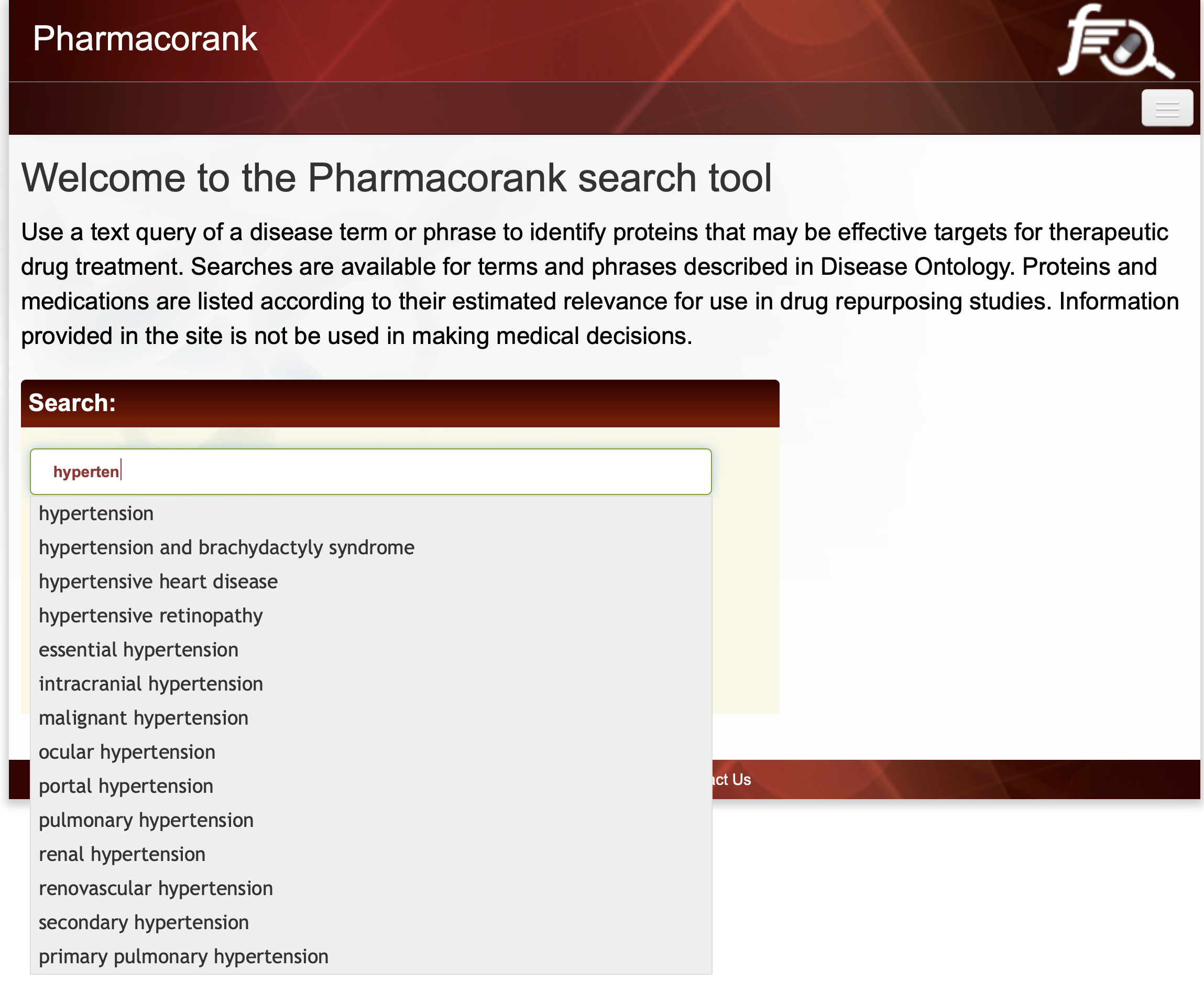 To initiate an interactive query, begin typing a disease name in the query input box. The corresponding Disease Ontology term will be identified with an autocomplete feature if the disease was found to have associated proteins. Here we review the results when the query term is hypertension. Shown in Figure 1 is the autocomplete tool identifying possible search terms based on the user’s input.
