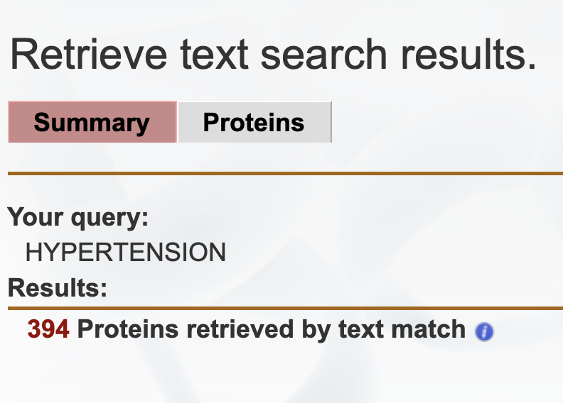 After clicking on the search button, a summary of the prioritized list of target proteins retrieved is displayed, as shown in Figure 2. The total number of proteins retrieved by the text matching algorithm is displayed. One can click on the red number that indicates the total number of proteins retrieved and next be taken to a prioritized list of target proteins.